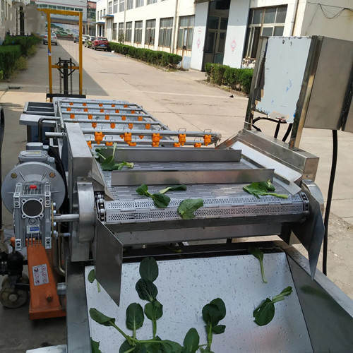 首先需要清洗的蔬菜全部放入水槽,在高壓水流和強(qiáng)力氣泡的作用下,被充分打散、翻滾、清洗、傳送。蔬菜表面的泥沙會脫落,網(wǎng)帶清洗機(jī)沉淀到底部隔離倉,防止翻揚(yáng)回流造成再度污染。從而蔬菜上洗落下來的雜物和小蟲會漂浮在水面,然后被網(wǎng)孔收集,溢出水槽的水流被排除水箱,進(jìn)入尼龍袋中。蔬菜被蔬菜清洗機(jī)洗干凈后,再經(jīng)過噴淋的清洗,網(wǎng)帶清洗機(jī)然后通過輸送帶送出,傳送帶末端有一個吹起裝置,沒有被清理掉的雜物被吹掉。(食品加工機(jī)械廠家Tel:138*5448-1138)